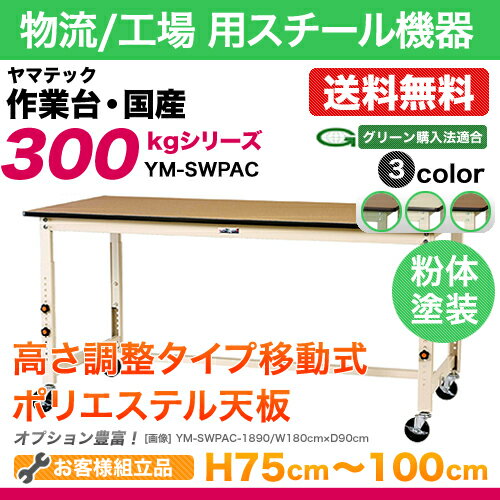 ヤマテック 作業台【300シリーズ】高さ調整タイプ移動式/ポリエステル天板【21mm】100φゴムキャスターストッパー付4個 [表示寸法:W900×D750×H7500〜1000] グリーン購入法適合商品【お客様組立品】