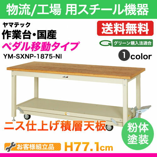 ヤマテック 作業台 ペダル移動タイプ/ニス仕上げ積層天板【36mm】 [表示寸法:W1800×D750×H762] 仕様:100φゴムキャスター4ヶ グリーン購入法適合商品【お客様組立品】