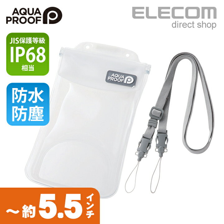 ■対応機種:5.5インチ以下のスマートフォン■カラー:ホワイト■材質:本体:PVC ネックストラップ:ポリエステル ■付属品:ネックストラップ■その他:参考収容寸法:約幅75×高さ152×奥行き12mmエレコムダイレクトショップ水、砂、汚れからスマートフォンを守る!JIS保護等級 IP68相当の防水・防塵を実現するスマートフォン用防水・防塵ケース“AQUA PROOF”。