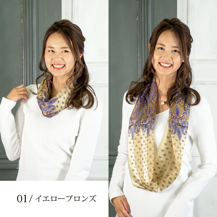 ギフト対応に関しての注意事項 商品詳細 商品番号 YS52713148 推奨適合シーズン 春〜秋 メンズ/レディース レディース 柄 カシミール小紋 カラーバリエーション 01/イエローブロンド02/ベージュ03/ブルー04/グレー 原産国 日本 素 材 シルク100% 重 量 約13g サイズ(約) 28cm×63(外周126) 商品詳細 横浜伝統技術、職人の手捺染によるハンドプリントで仕上げた、シルク100%ループストールです。
